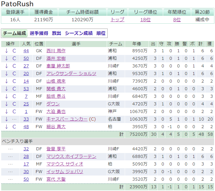 相性の良い浦和&川崎を中心に編成しました。浦和のFWカンテがスタメンなら起用してみたかったですがスタメン見れないので今回は見送りです。